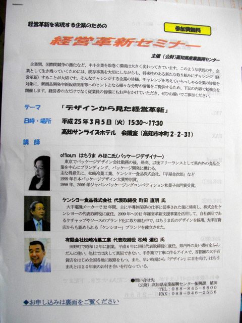 2013年3月5日 高知サンライズホテルにおいて高知県産業振興センター主催の経営革新セミナーが開催され、「デザインから見た経営革新」というテーマでoffice,mのはちうま氏(デザイナー)、松崎冷菓工業の松崎社長と弊社社長町田直明が講演を致しました。
